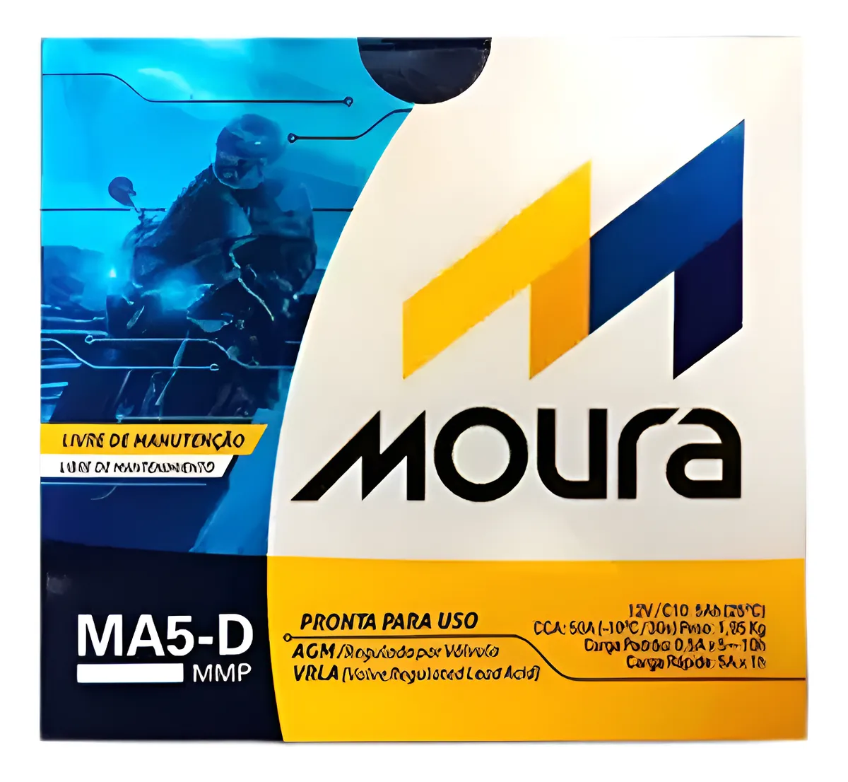 Desenvolvida com tecnologia mundial de ponta e alta resistência para rodar mais, a Bateria Moura Moto possui duas versões: AGM/Regulada por válvula com elementos blindados (livre de manutenção), e a ventilada que permite manutenção e que possui íons ativos de proteção. Ambas atendem motocicletas, scooters, quadriciclos e motos náuticas que vão de 50cc até 2300cc. A Bateria Moura Moto 5Ah 12V – MA5-D ( Antiga MA6-D ) – Selada AGM ( Ref. Yuasa: YTX5L-BS ) possui vida útil até 50% superior à média do mercado. Nas últimas duas décadas os acessórios elétricos dos motos cresceram expressivamente. No entanto, o aumento da necessidade do uso de eletricidade causa o desgaste mais rápido da bateria. Diante deste cenário, os produtos da Moura são destaque em qualidade. Sempre investindo em tecnologia e inovação, a empresa reforça seu compromisso com o consumidor e apresenta a renovação de sua linha de acumuladores de 40 a 200 amperes-hora, que atendem de veículos leves a pesados. A Moura realizou melhorias, chegando a uma linha com maior robustez e máxima resistência a condições adversas de uso. Entre as novidades, o prazo de garantia de 18 meses para baterias de até 75 amperes-hora. Mais uma vez a Moura promove uma evolução nos seus produtos para atender cada vez melhor os consumidores.