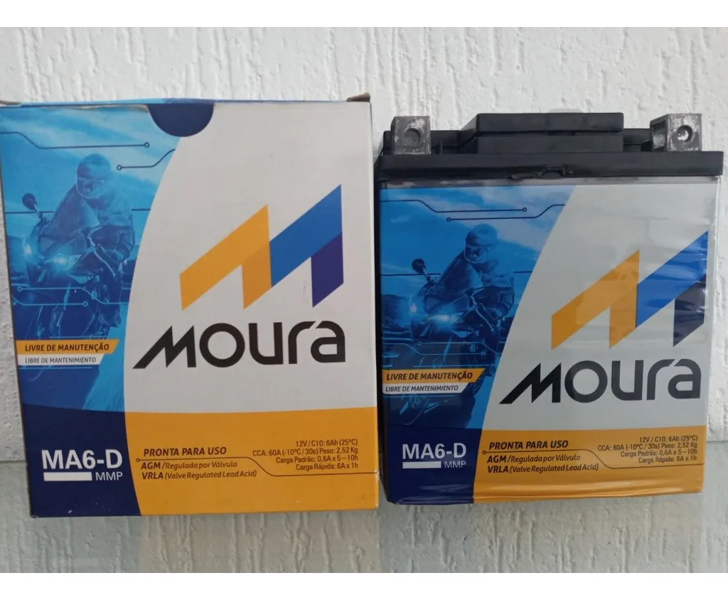 Desenvolvida com tecnologia mundial de ponta e alta resistência para rodar mais, a Bateria Moura Moto possui duas versões: AGM/Regulada por válvula com elementos blindados (livre de manutenção), e a ventilada que permite manutenção e que possui íons ativos de proteção. Ambas atendem motocicletas, scooters, quadriciclos e motos náuticas que vão de 50cc até 2300cc. A Bateria Moura Moto 6Ah 12V – MA6-D ( Antiga MA7-D ) – Selada AGM ( Ref. Yuasa: YTX7L-BS ) possui vida útil até 50% superior à média do mercado. Nas últimas duas décadas os acessórios elétricos dos motos cresceram expressivamente. No entanto, o aumento da necessidade do uso de eletricidade causa o desgaste mais rápido da bateria. Diante deste cenário, os produtos da Moura são destaque em qualidade. Sempre investindo em tecnologia e inovação, a empresa reforça seu compromisso com o consumidor e apresenta a renovação de sua linha de acumuladores de 40 a 200 amperes-hora, que atendem de veículos leves a pesados. A Moura realizou melhorias, chegando a uma linha com maior robustez e máxima resistência a condições adversas de uso. Entre as novidades, o prazo de garantia de 18 meses para baterias de até 75 amperes-hora. Mais uma vez a Moura promove uma evolução nos seus produtos para atender cada vez melhor os consumidores.